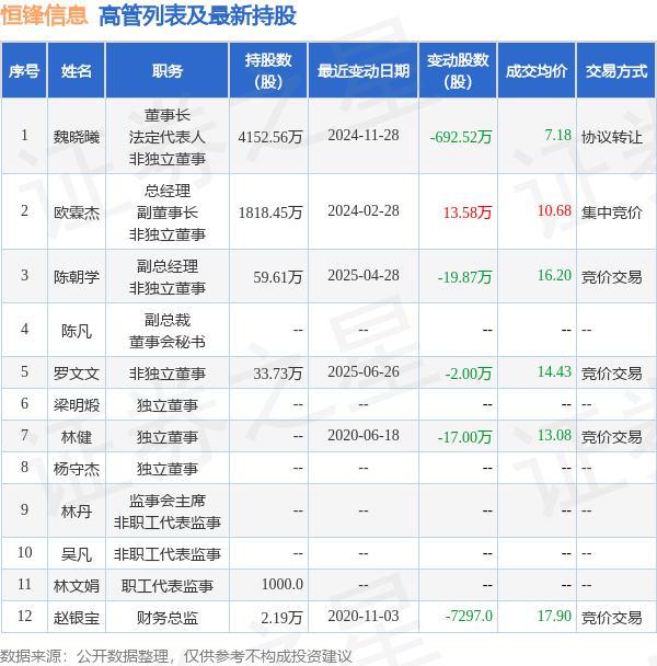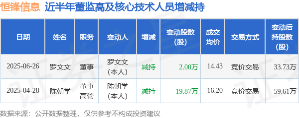 恒锋信息近半年内的董监高及核心技术人员增减持详情如下: